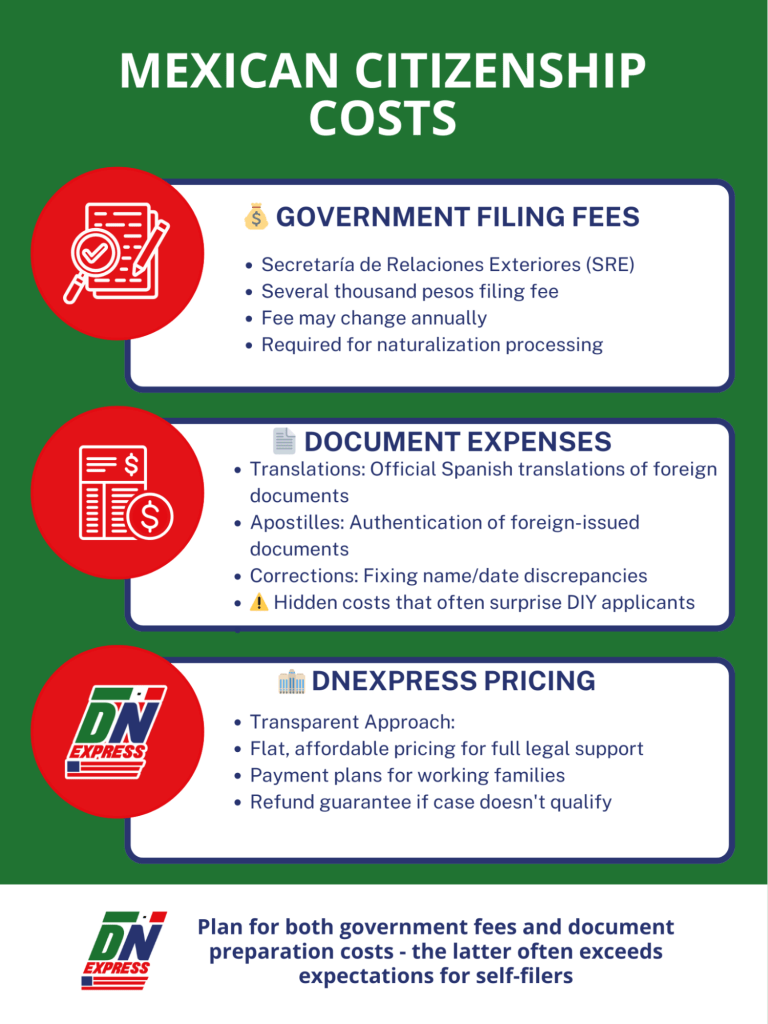 Applying for Mexican citizenship through naturalization comes with two types of costs: official government fees and supporting expenses related to documents.