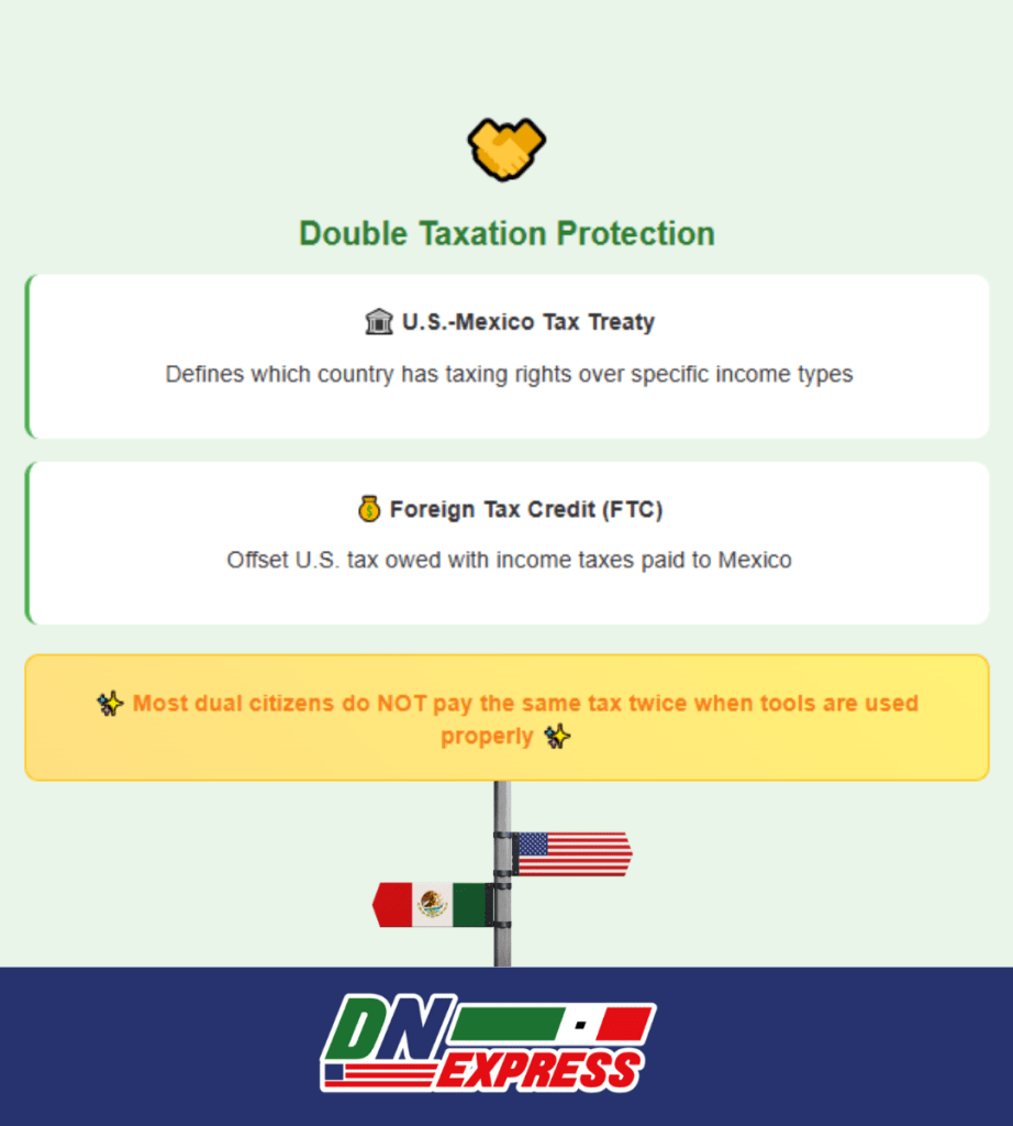 True double taxation is rare. The U.S.–Mexico tax treaty and the Foreign Tax Credit usually prevent paying twice on the same income, based on international frameworks like the OECD Model Tax Convention.