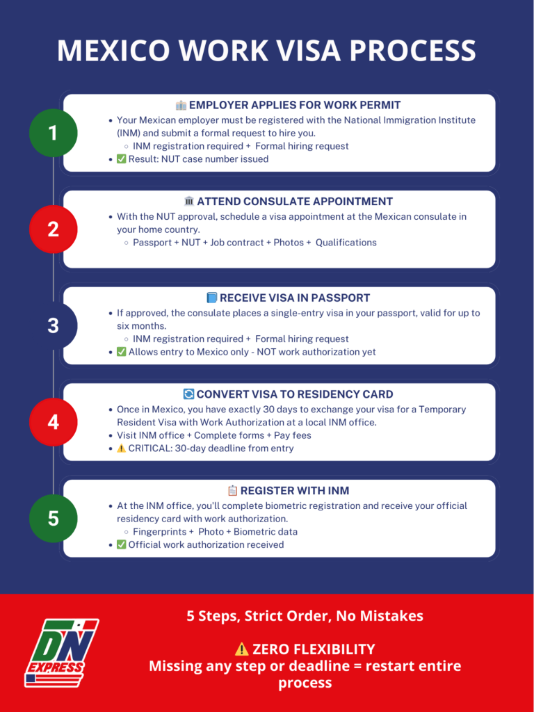 Your Mexican employer must be registered with the National Immigration Institute (INM) and submit a formal request to hire you. If approved, INM issues a case number (NUT) that you will use at the consulate.