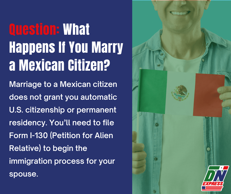 Marriage to a Mexican citizen does not grant you automatic U.S. citizenship or permanent residency. You’ll need to file Form I-130 (Petition for Alien Relative) to begin the immigration process for your spouse.