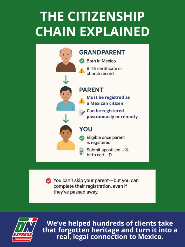In this case, your grandparent plays an important supporting role. Their documents help prove your parent’s Mexican birth, and once that link is established, your own citizenship becomes possible.