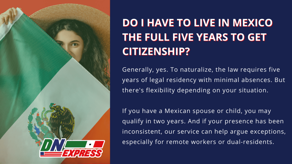 Typically, it takes 5 years: 4 years of temporary residency, followed by 1 year of permanent residency before you can apply for naturalization. In some cases, like marriage to a Mexican citizen, this timeline can be shortened to 2 years.