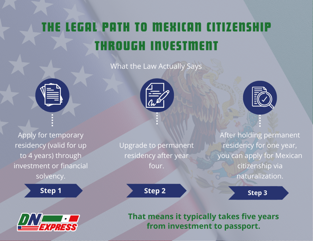 Instead, Mexico offers a residency-by-investment path, which, when combined with time, presence in the country, and legal compliance under Mexican Immigration Law, can lead to naturalization and citizenship.