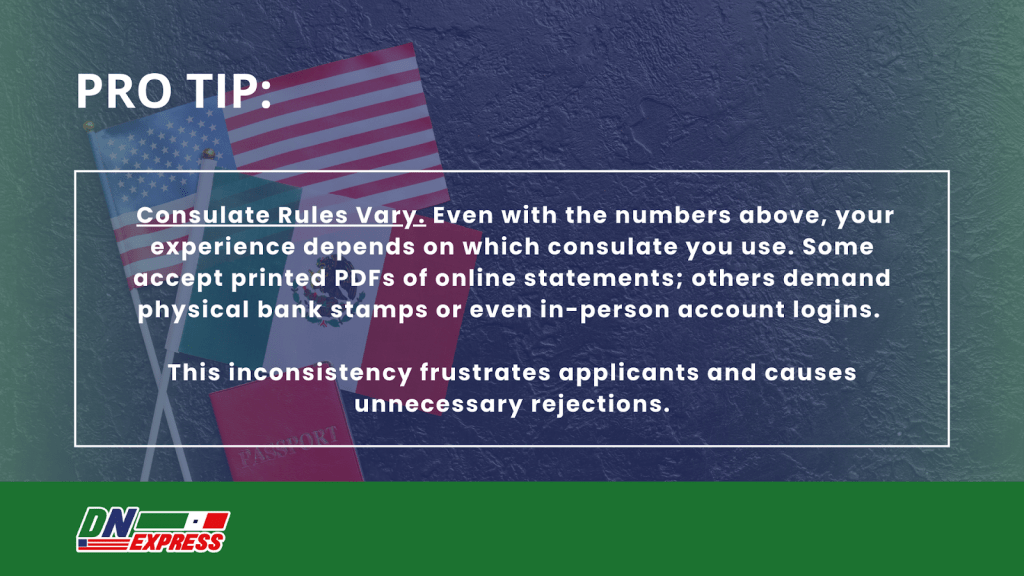 Even with the numbers above, your experience depends on which consulate you use. Some accept printed PDFs of online statements; others demand physical bank stamps or even in-person account logins.