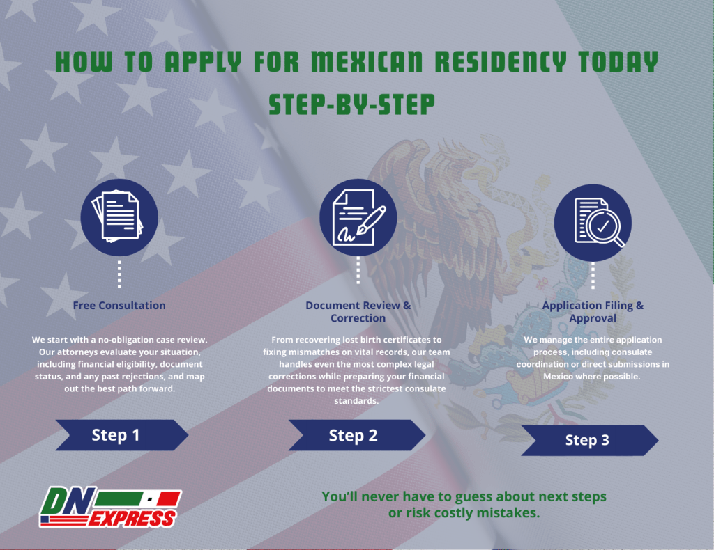 Getting your Mexican temporary residency doesn’t have to feel overwhelming. With DNExpress, the process is simplified into three clear steps: