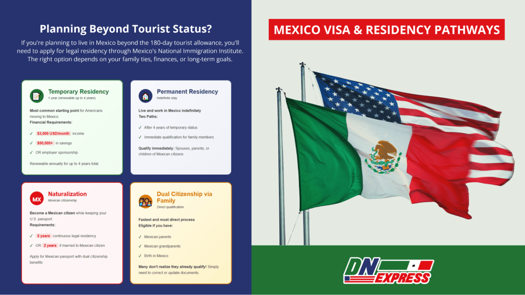 If you're planning to live in Mexico beyond the 180-day tourist allowance, you'll need to apply for legal residency through Mexico's National Immigration Institute or citizenship pathway. The right option depends on your family ties, finances, or long-term goals.
