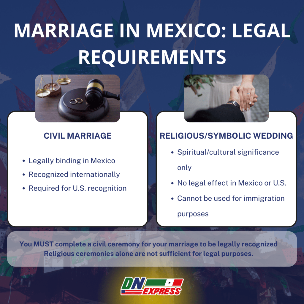 In Mexico, only civil marriages performed at the Registro Civil (Civil Registry) are legally binding. A church wedding may carry spiritual or cultural importance, but by itself it has no legal effect, neither in Mexico nor in the U.S.