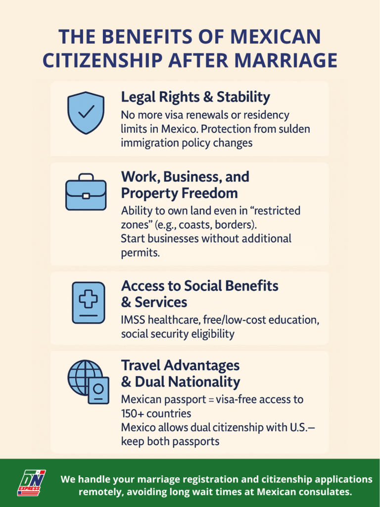 Citizenship eliminates restrictions on owning property in Mexico’s “restricted zones,” such as coastal and border areas where foreigners typically require a bank trust (fideicomiso).
