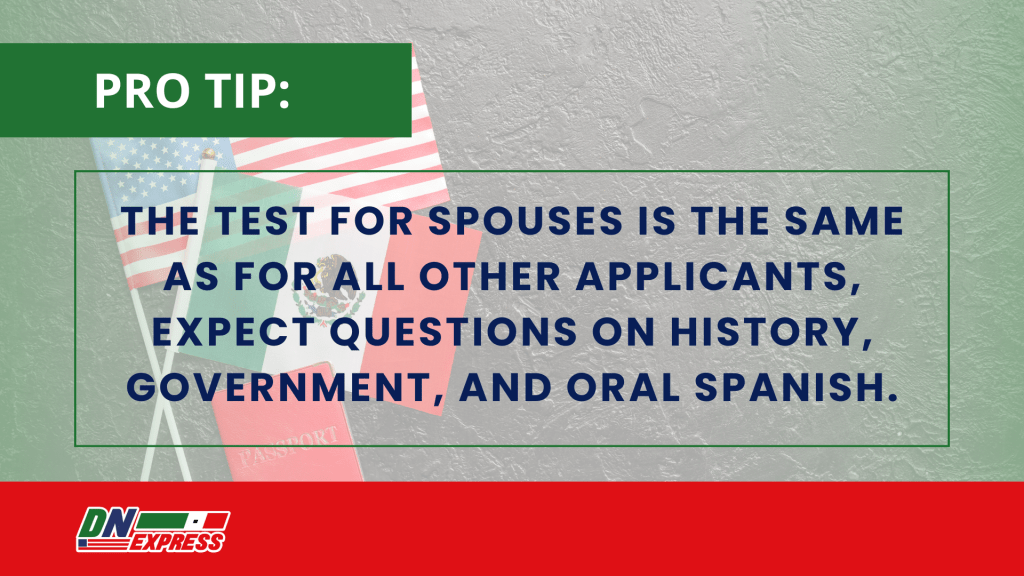 Pro Tip: The test for spouses is the same as for all other applicants, expect questions on history, government, and oral Spanish.