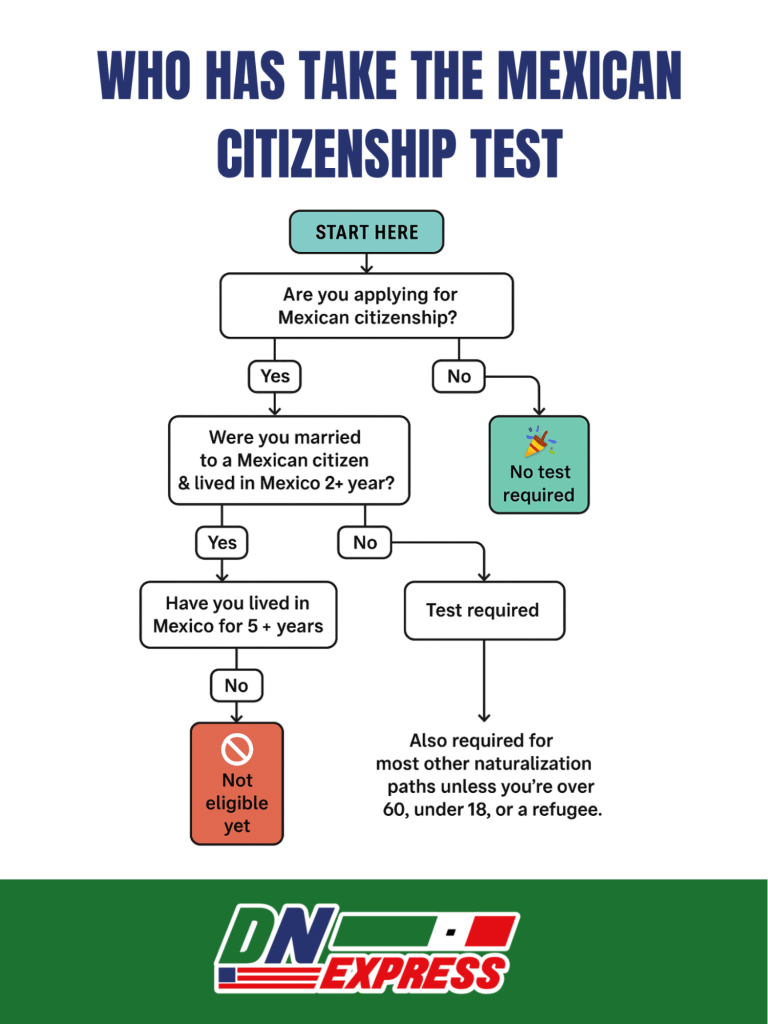 - Spouses of Mexican citizens applying after 2 years of residency are also required to test, unless exempt.