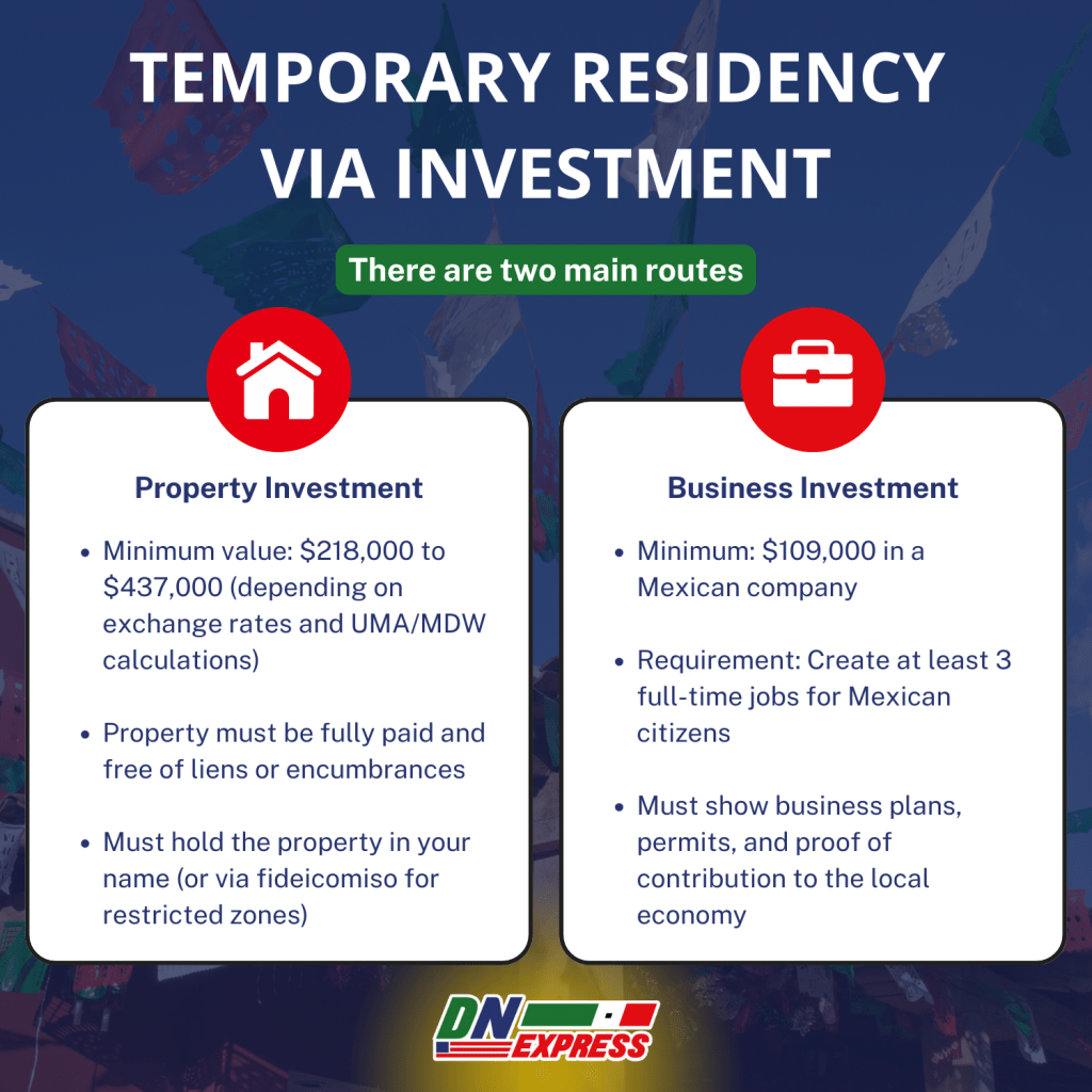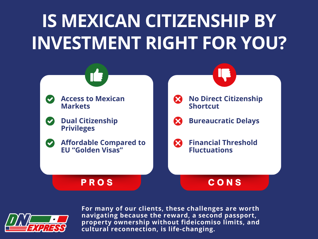 - In this guide, we’ll break down everything you need to know, from investment requirements and timelines to potential risks and how to avoid costly mistakes. Whether you’re dreaming of beachside living or global mobility, we’ll show you exactly how Mexico’s residency-by-investment program works, and how Doble Nacionalidad Express can help you get there without the consulate headaches.