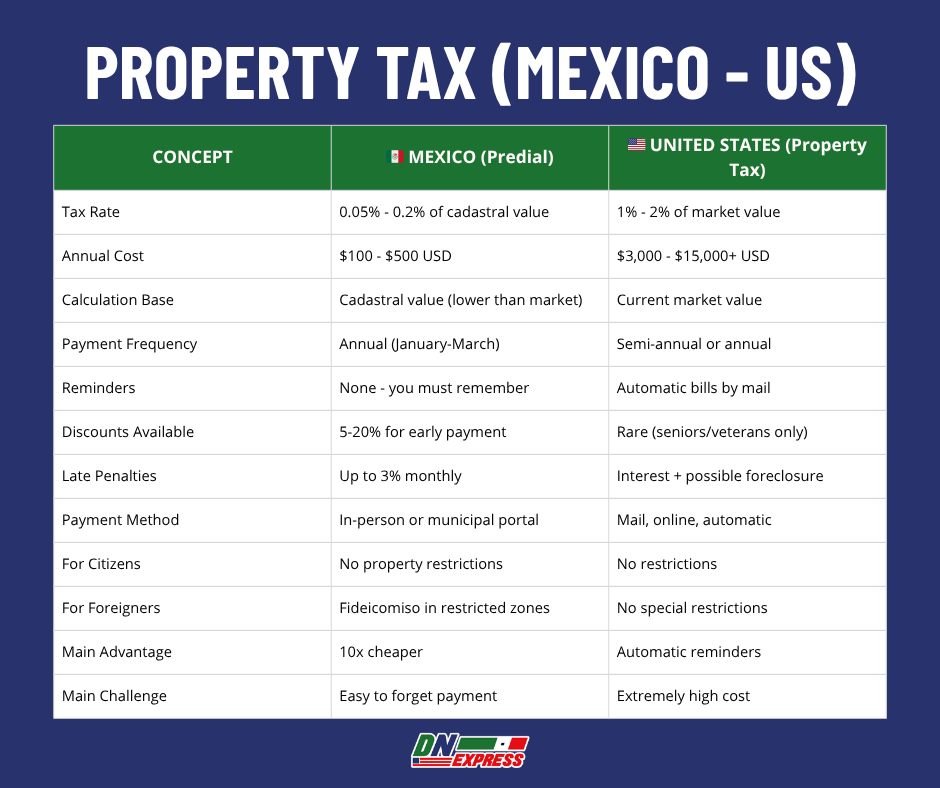 Unlike the U.S., where taxes are typically 1%–2% of market value annually, Mexico's Predial rates are between 0.05% and 0.2% of the cadastral value, depending on your municipality.